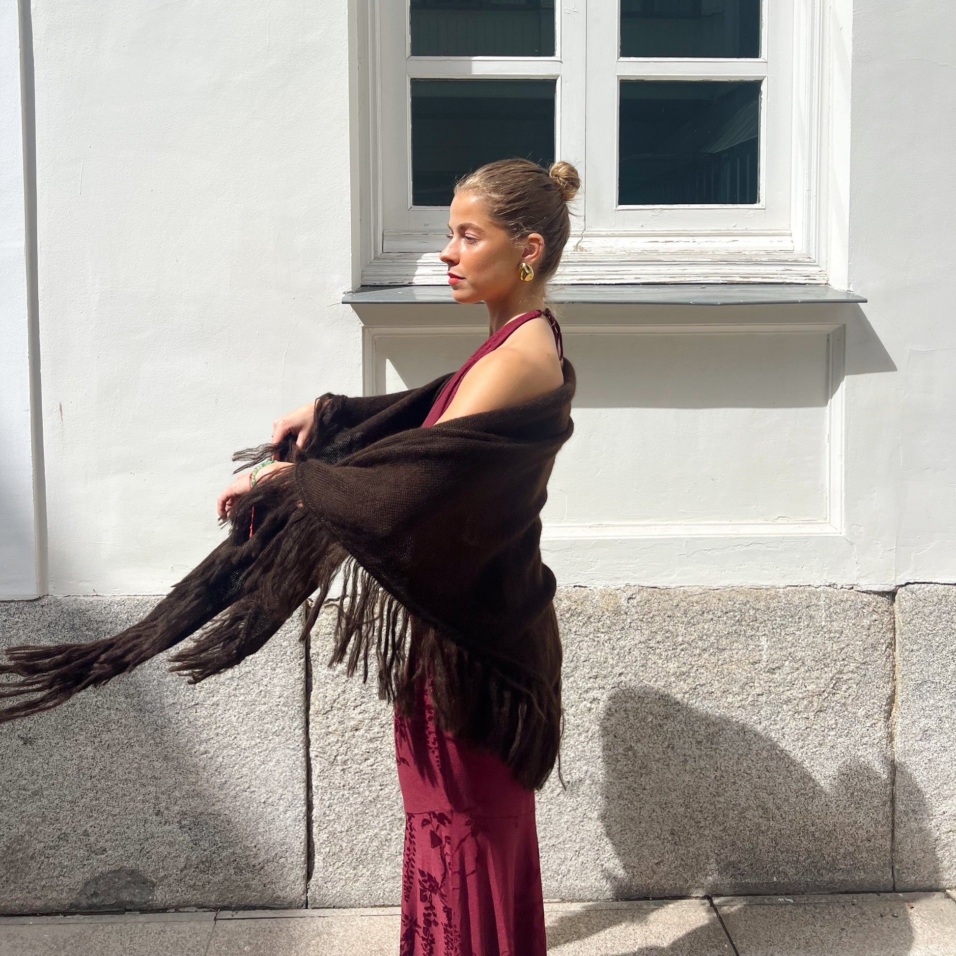 Con unas medidas aproximadas de 250 x 110 cm, este chal ofrece infinitas formas de llevarlo: suelto sobre los hombros, cruzado al pecho o como capa envolvente para un aire más acogedor.