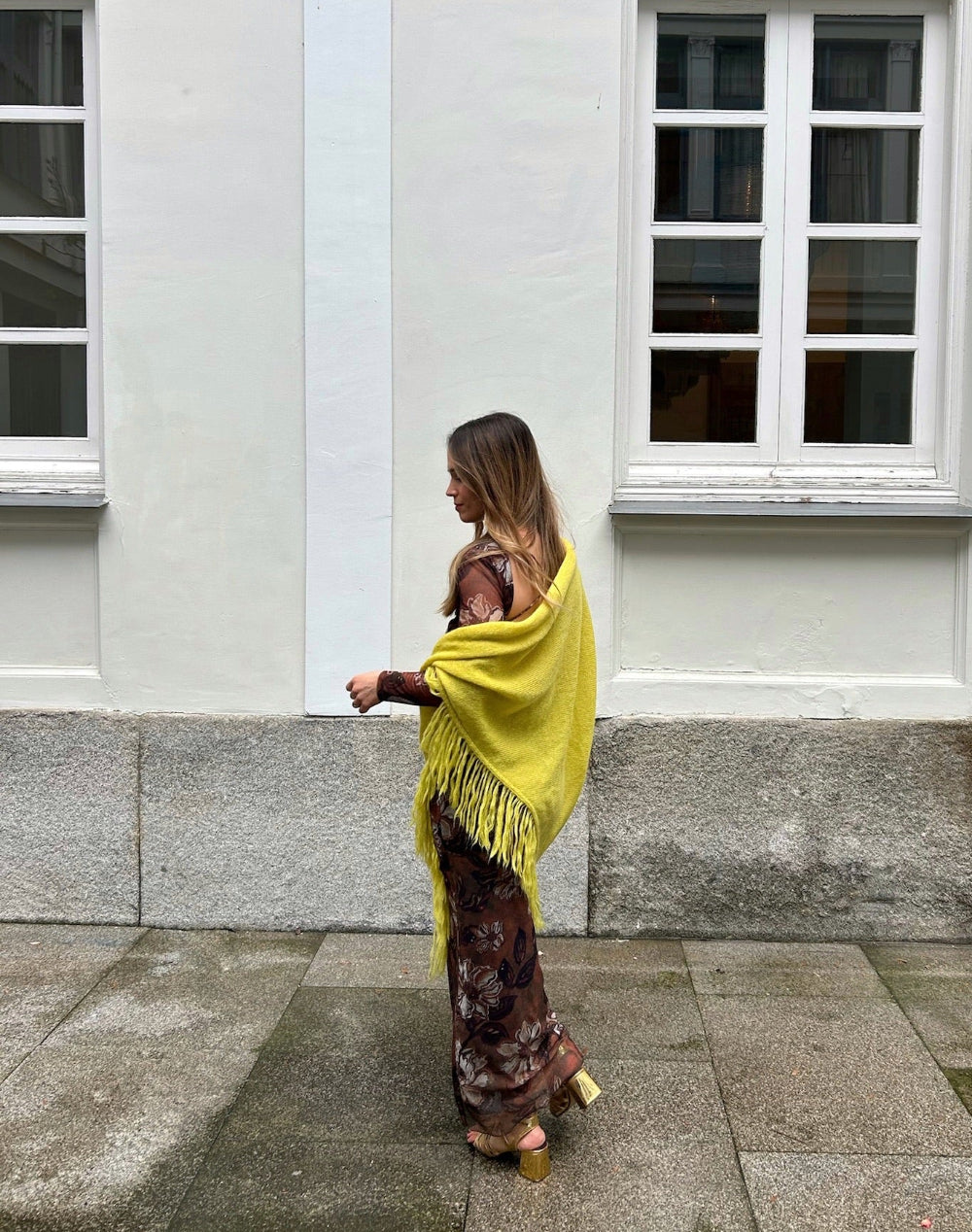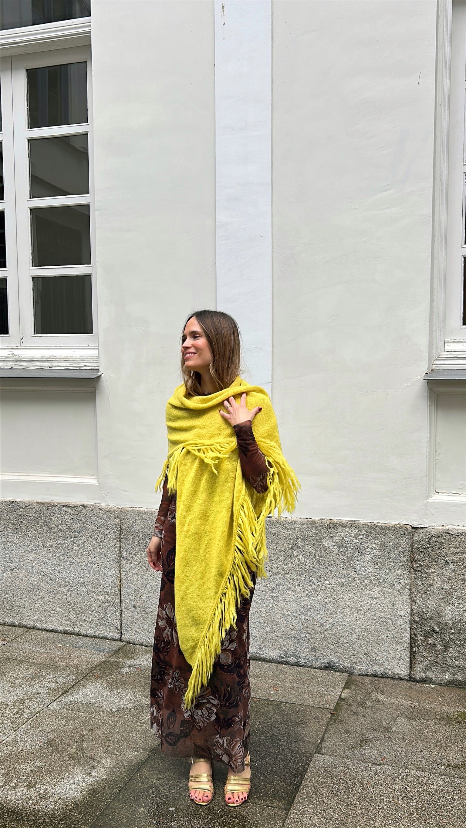 Su diseño triangular, rematado con flecos en los extremos, lo convierte en un accesorio muy elegante y versátil a la vez. Ligero y suave al tacto, es una pieza atemporal que aporta estilo sin renunciar a la comodidad.