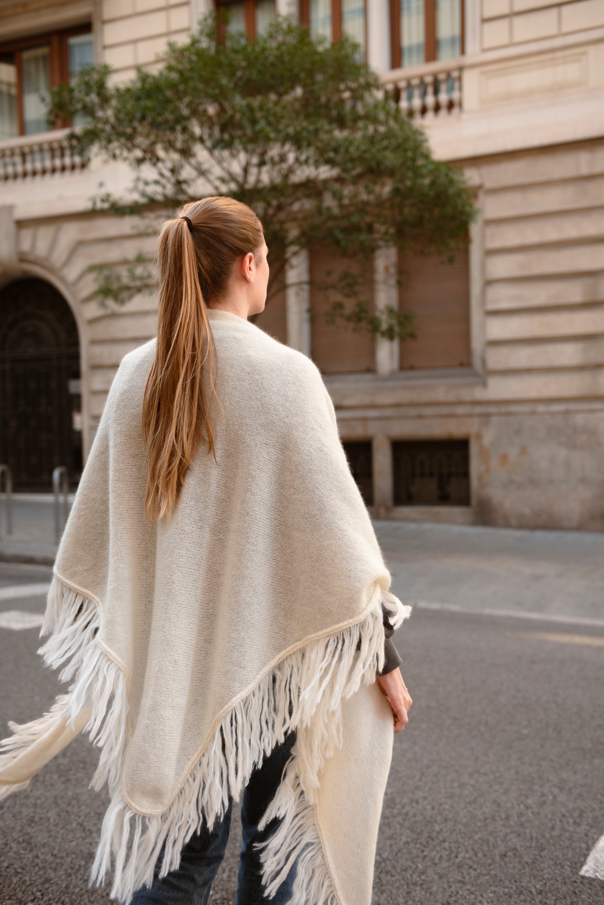 Con unas medidas aproximadas de 250 x 110 cm, este chal ofrece infinitas formas de llevarlo: suelto sobre los hombros, cruzado al pecho o como capa envolvente para un aire más acogedor.