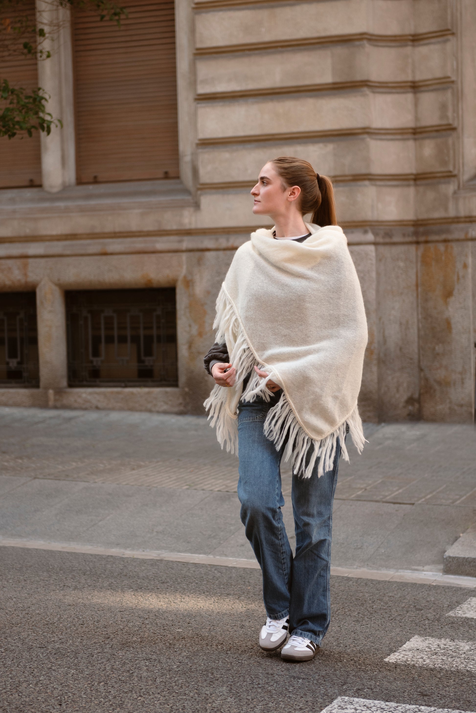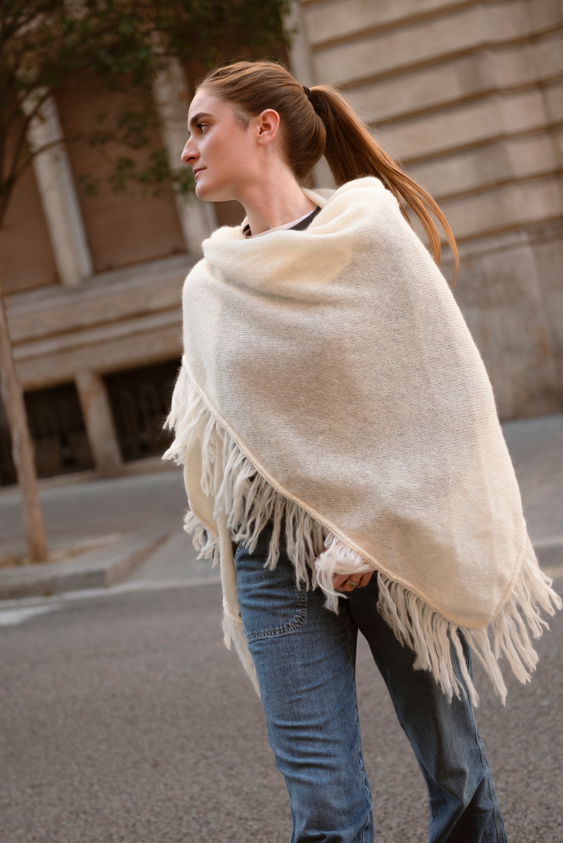 Su diseño triangular, rematado con flecos en los extremos, lo convierte en un accesorio muy elegante y versátil a la vez. Ligero y suave al tacto, es una pieza atemporal que aporta estilo sin renunciar a la comodidad.