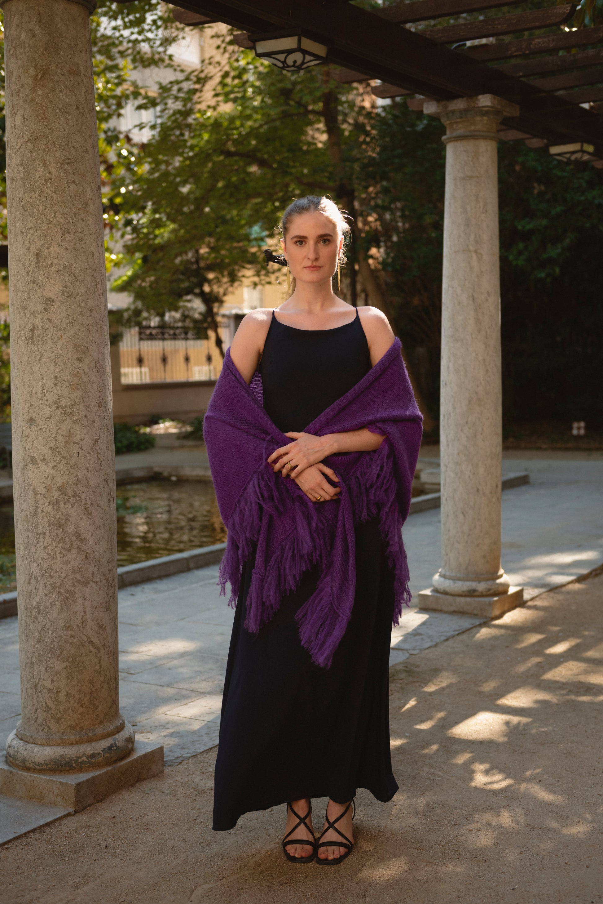 Con unas medidas aproximadas de 250 x 110 cm, este chal ofrece infinitas formas de llevarlo: suelto sobre los hombros, cruzado al pecho o como capa envolvente para un aire más acogedor.