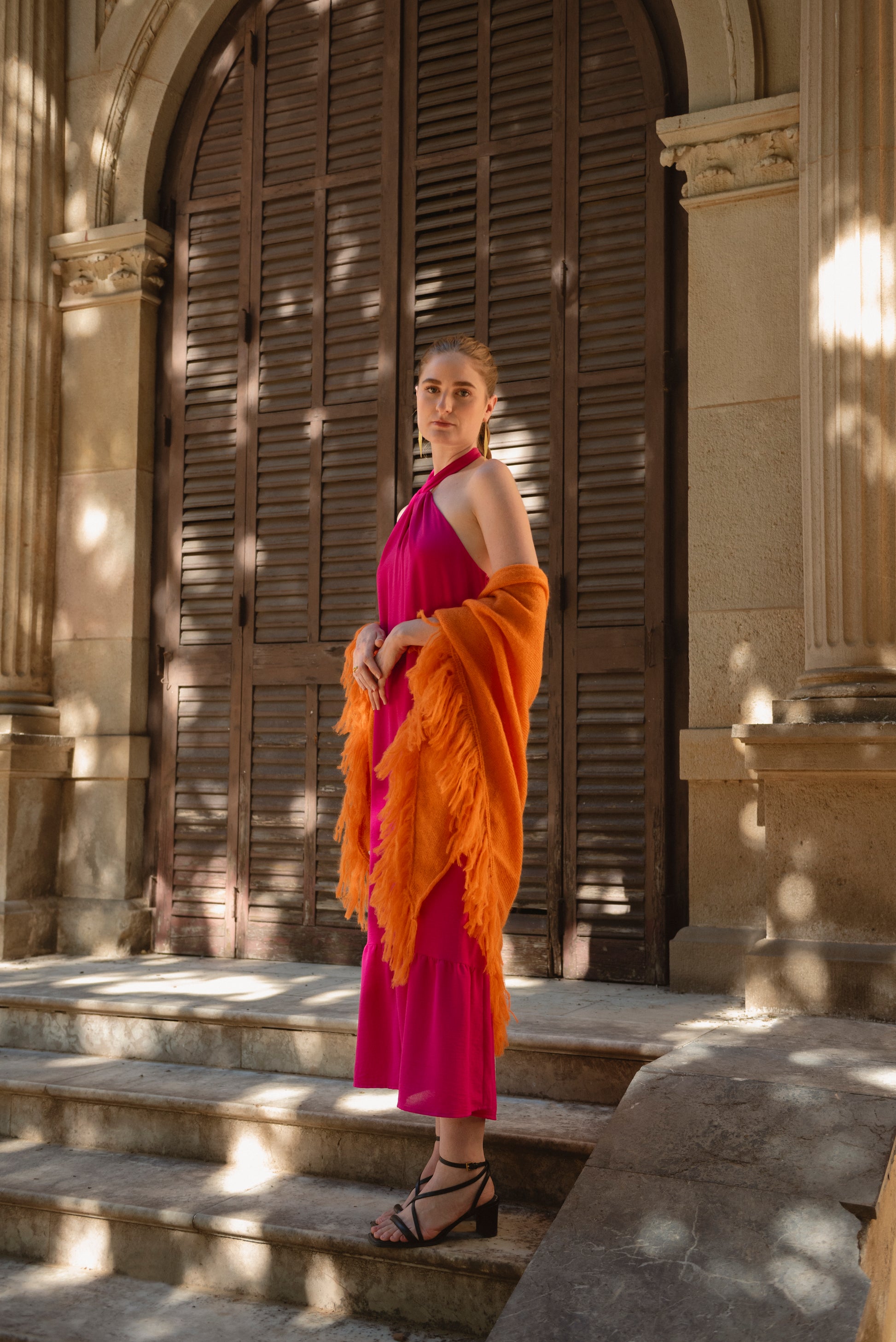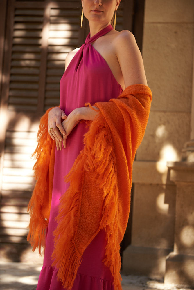 Su diseño triangular, rematado con flecos en los extremos, lo convierte en un accesorio muy elegante y versátil a la vez. Ligero y suave al tacto, es una pieza atemporal que aporta estilo sin renunciar a la comodidad.