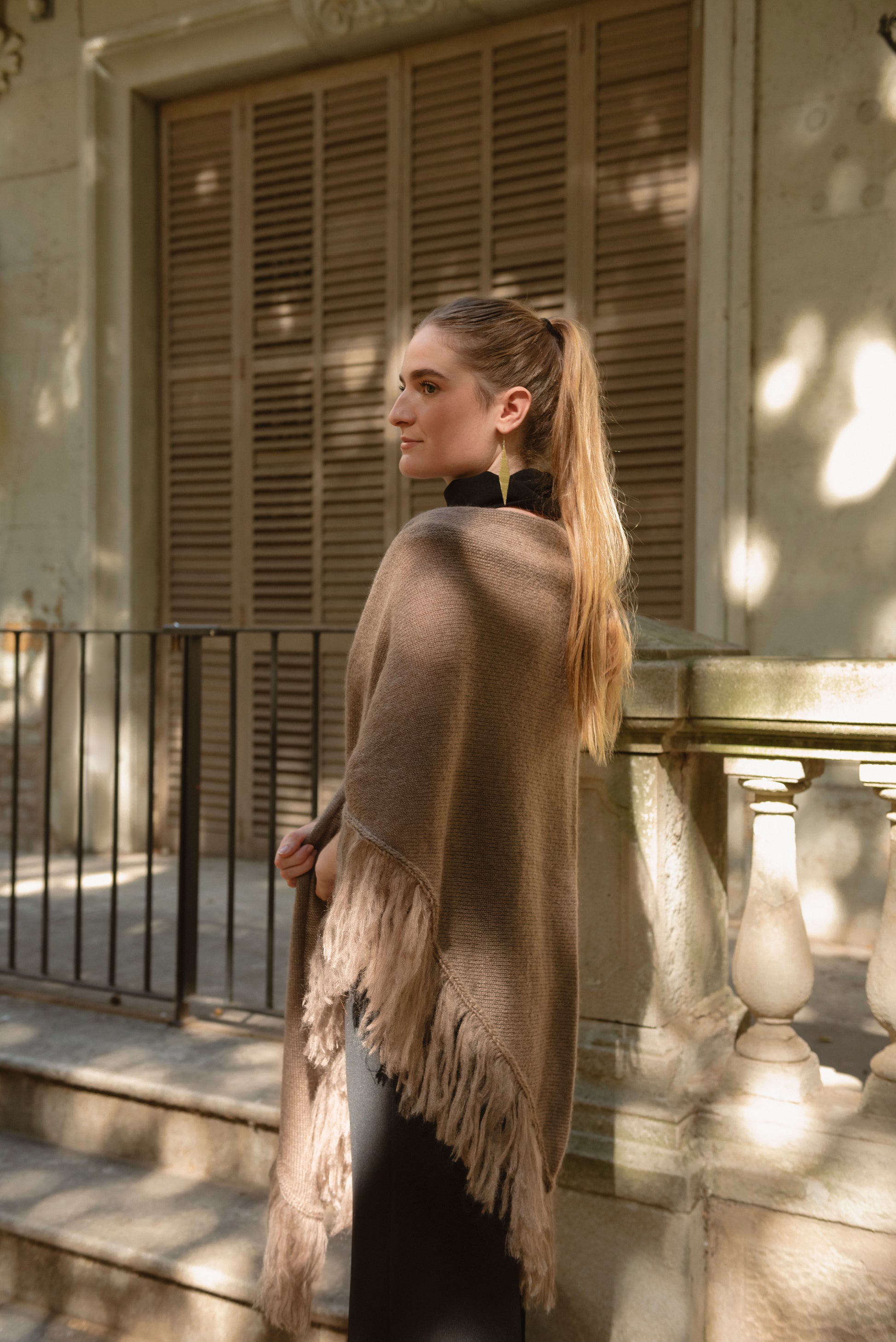 Con unas medidas aproximadas de 250 x 110 cm, este chal ofrece infinitas formas de llevarlo: suelto sobre los hombros, cruzado al pecho o como capa envolvente para un aire más acogedor.